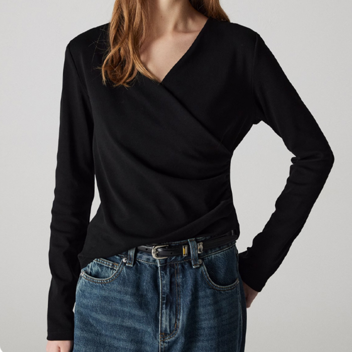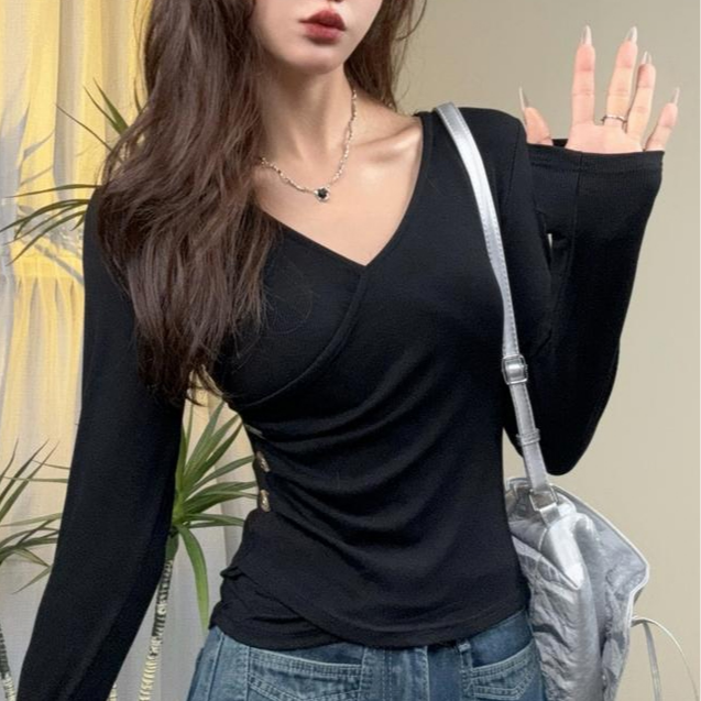 デザイン感のあるスリムVネック長袖トップス