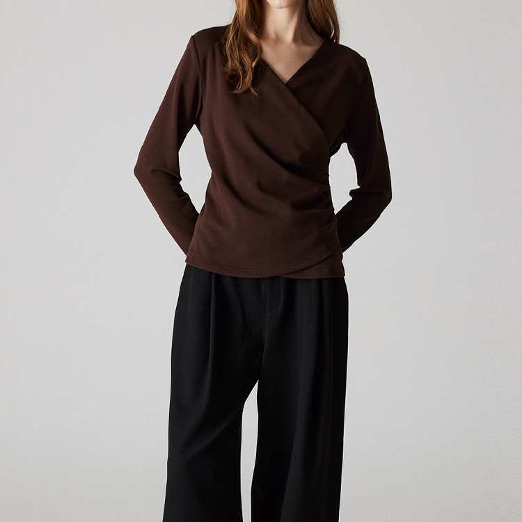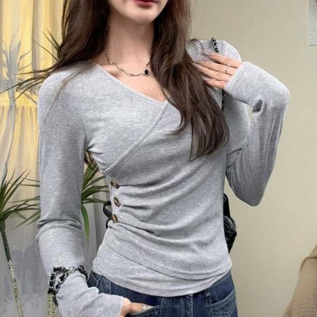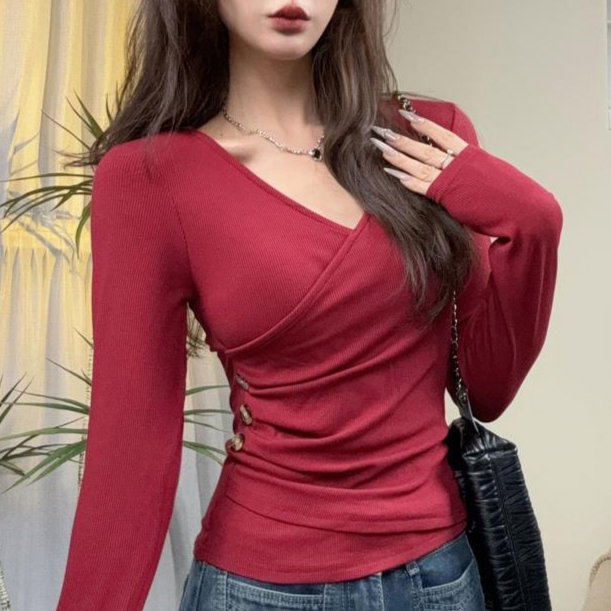 デザイン感のあるスリムVネック長袖トップス